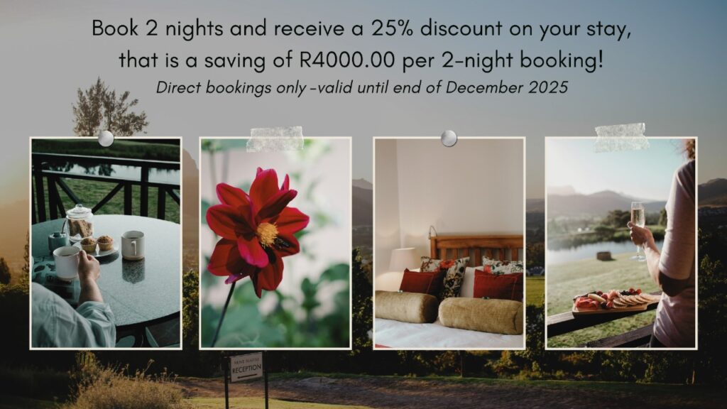 Overlooking a fish-filled lake and Franschhoek’s charming village below, it is the ideal setting for a relaxing weekend of leisure. For those who wish to escape city life and experience the sheer joy of silence, beauty, and unassuming simplicity in a charming country retreat, our chalets are the ideal destination.